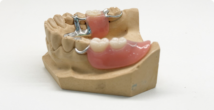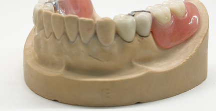 Бюгельный протез фиксируется к опорным зубам с помощью скрытой замковой системы, которая полностью интегрирована в конструкцию. Благодаря этому протез практически незаметен при разговоре и улыбке.