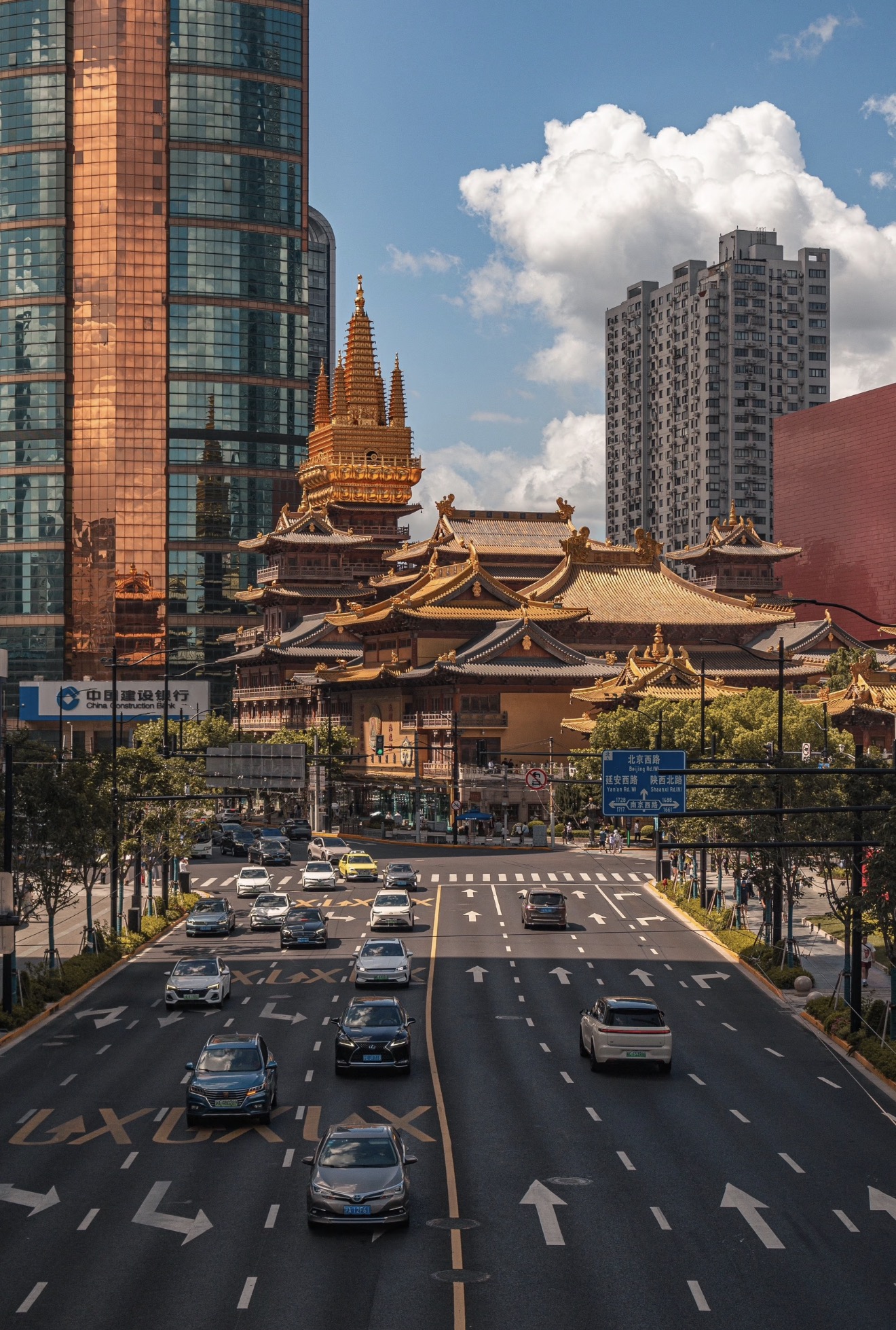 • Пешеходный мост снаружи храма — сверху отлично видно золотые крыши, поток машин и небоскрёбы: настоящий магический Шанхай.