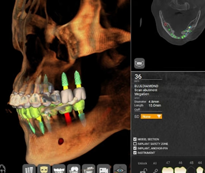 В нашей клинике используется цифровая система планирования, что позволяет точно спланировать место установки каждого импланта, минимизировать хирургическое вмешательство и сразу же установить индивидуальные протезы.